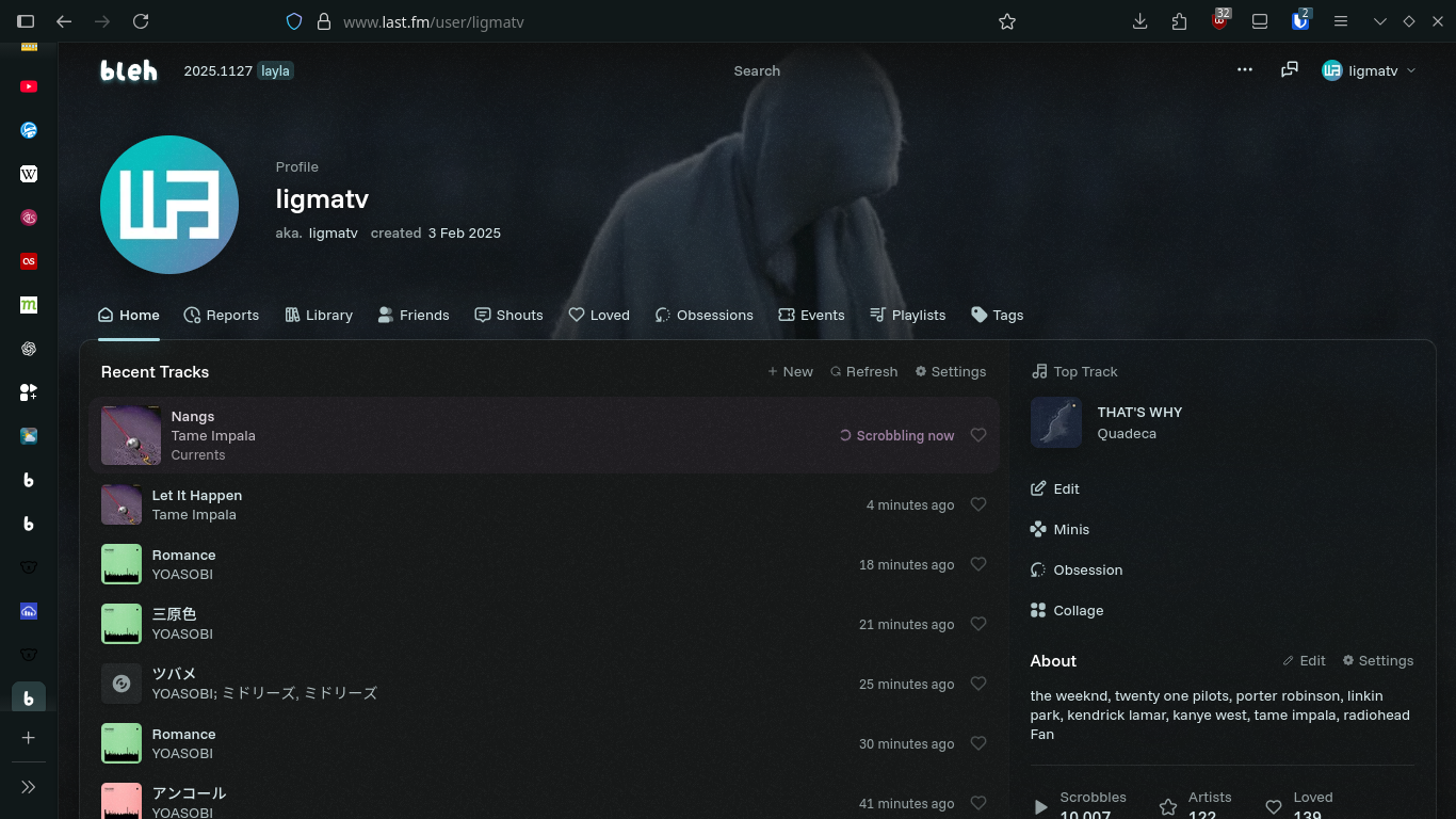 If you check the video, you can see that my last.fm just hit different, I use bleh for it, which is I know from fmty I mentioned before. It's really really make your last.fm looks really good-looking and like an fresh air. Basically, it's just an script to theming.