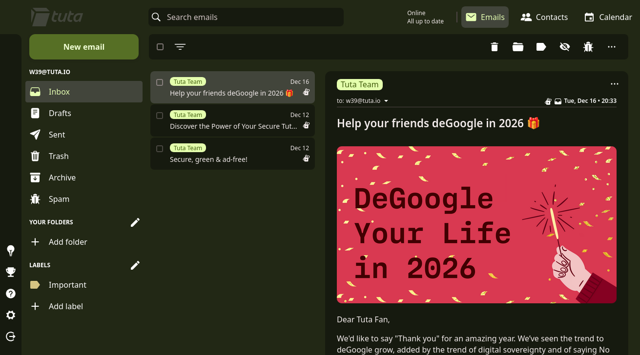 I switch to Tuta, because it's just simple, free, and user-friendly. It's all the anything you need to getting your mails. To simply doing it: