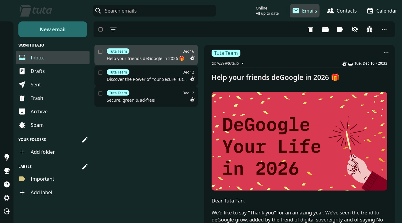 I switch to Tuta, because it's just simple, free, and user-friendly. It's all the anything you need to getting your mails. To simply doing it: